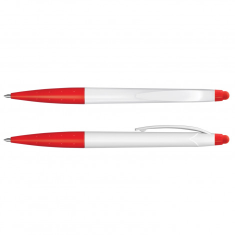 Twist-action plastic ballpoint pen with a white barrel and a stylus. The pen has a black refill with 500 metres of writing ink.